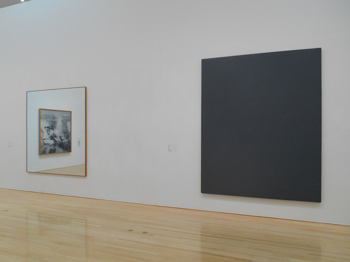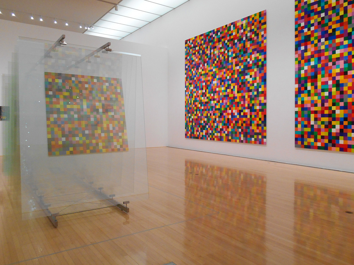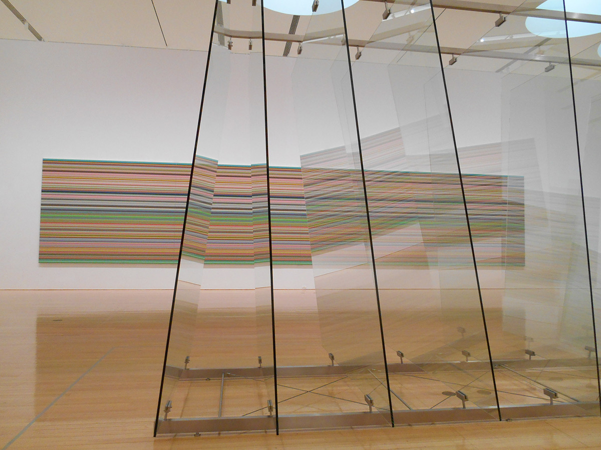 次の展示室に入って驚きました。カラフルで大型の2つの作品(《4900の色彩》と《ストリップ》)の間に、《8枚のガラス》という、タイトル通りの作品が置かれていて、後ろに下がって作品全体を見ようとすると邪魔になります。