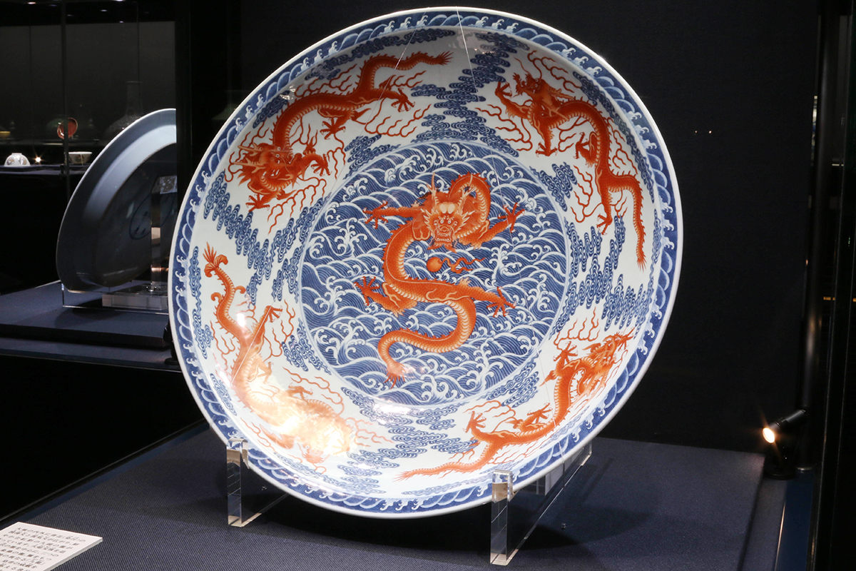 《青花紅彩龍濤文盤 景徳鎮窯》