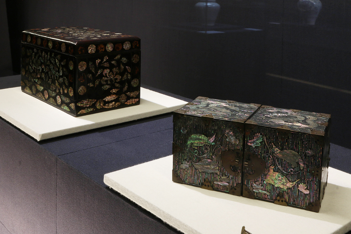 (左から)《黒漆牡丹唐草文玳瑁螺鈿箱》 / 《黒漆龍亀文螺鈿箪笥》