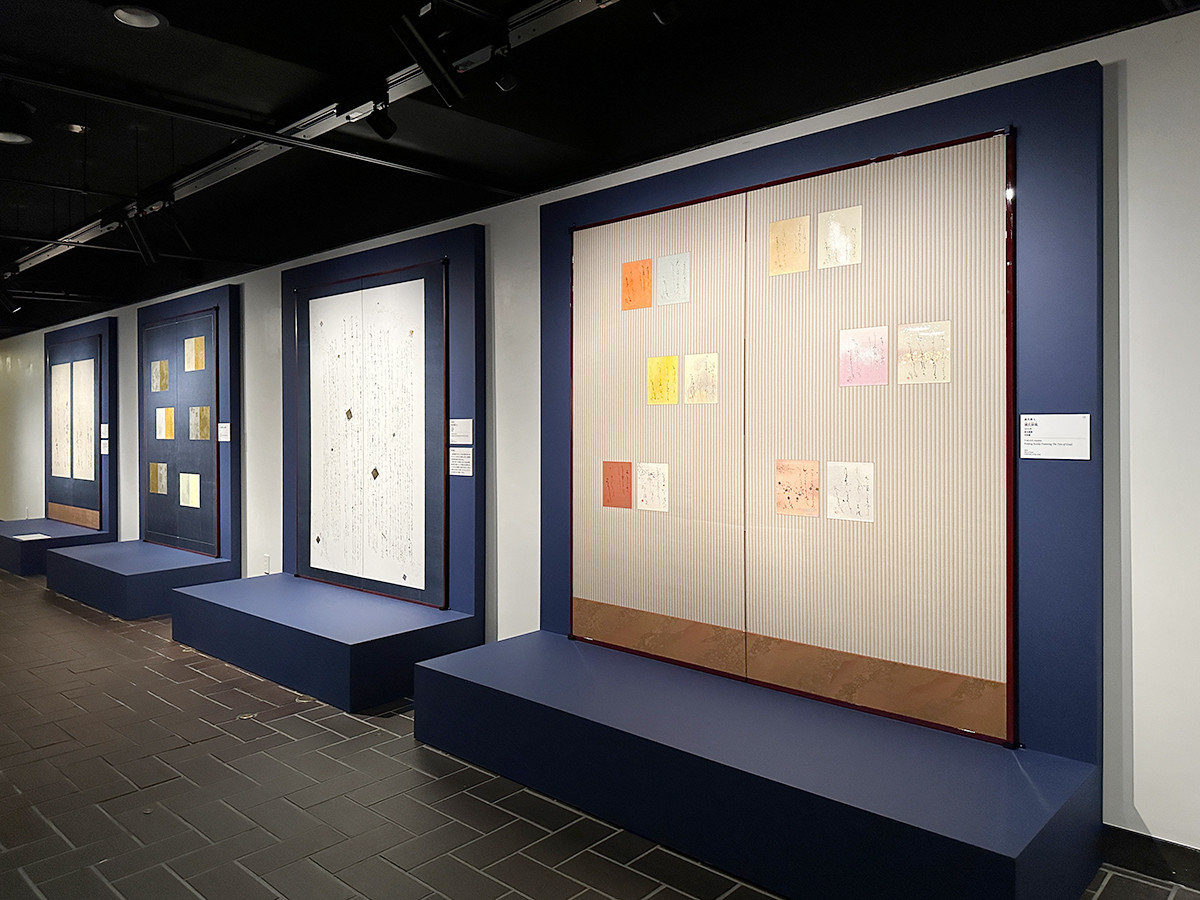 展示された作品には、「紫式部日記」や源氏物語の和歌が、空間に浮遊するかのように封じ込められています。