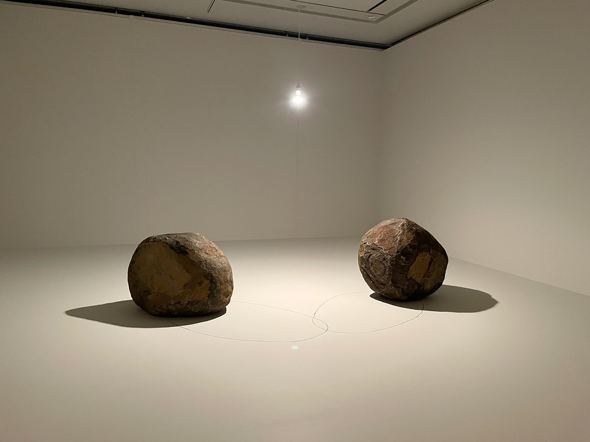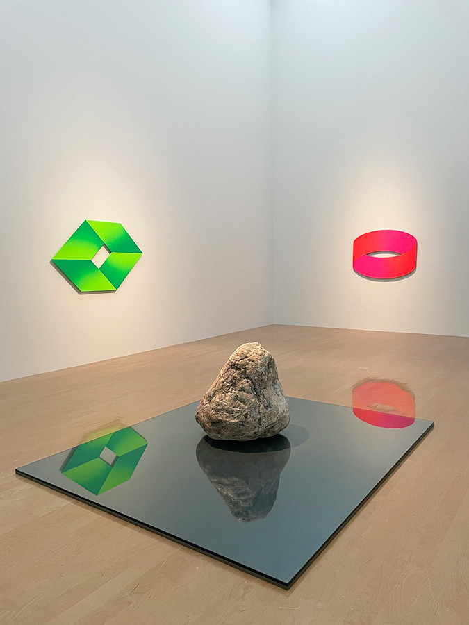 1968年東京国立近代美術館に出品されたピンクの蛍光塗料を用いた三連画《風景Ⅰ,Ⅱ,Ⅲ》に続き、石、鉄、ガラスを組み合わせた立体シリーズ《関係項》の1つが展示されています。石とガラスが在る―概念や意味よりも、「ものと場所」「ものともの」「ものと空間」に着目し制作されたものです。