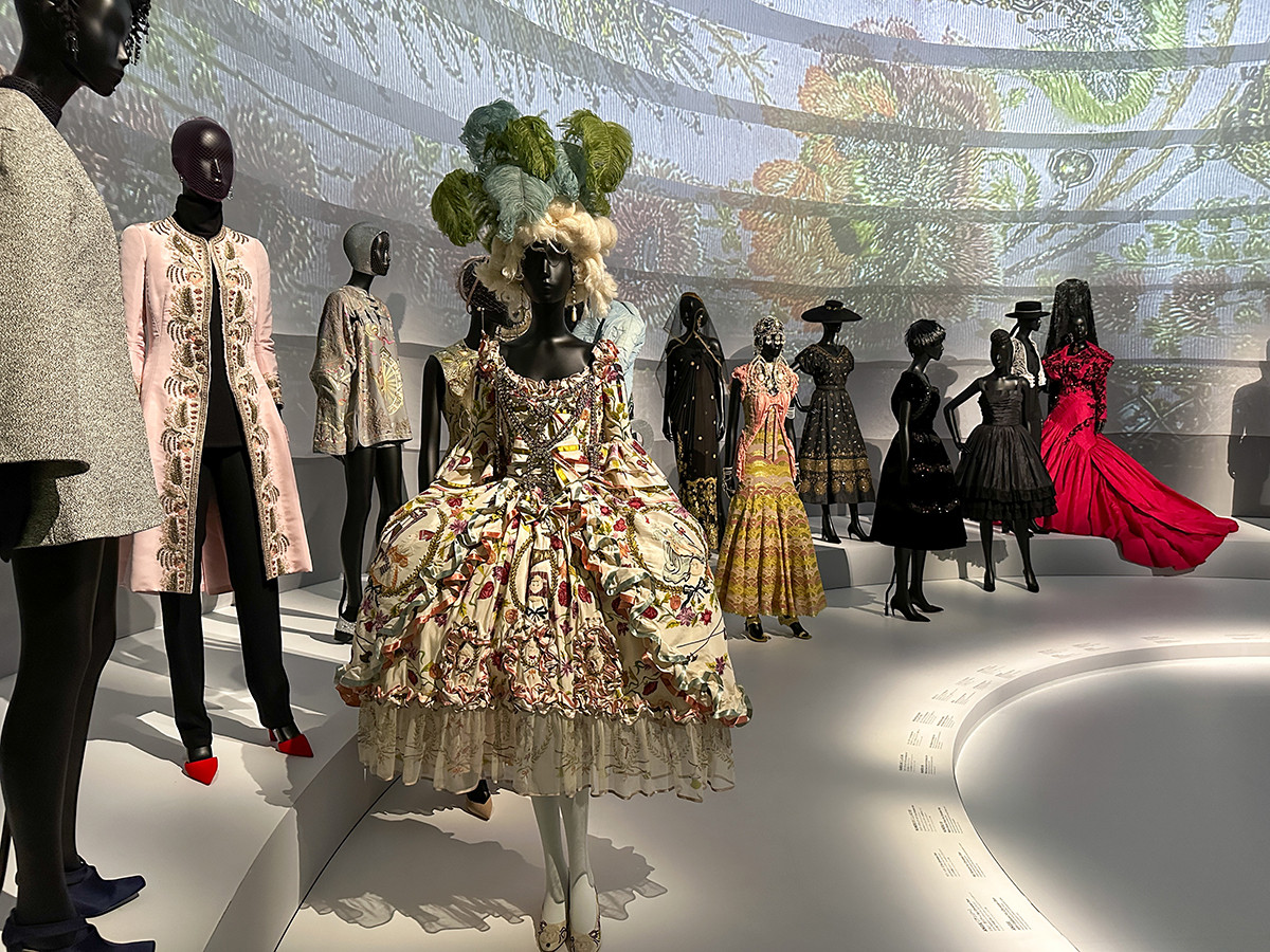 4つ目の部屋では、メゾン ディオールを率いたデザイナーごとの服を紹介。手前から奥に向かって、新しい順に並びます。
