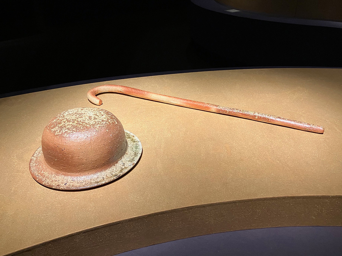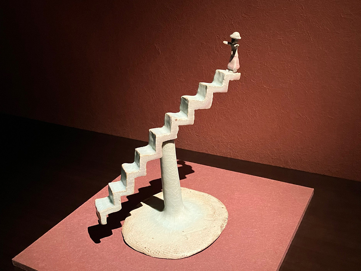 かたちの豊かさから私たち見るものに様々なイメージを思い起こさせる作品が今回の主役だ。今は亡き辻清明のなんともユーモラスな「信楽ステッキ」、階段で虹を表現した藤平伸の「虹」、階段の上に立つ小さな人物像が印象的だ。