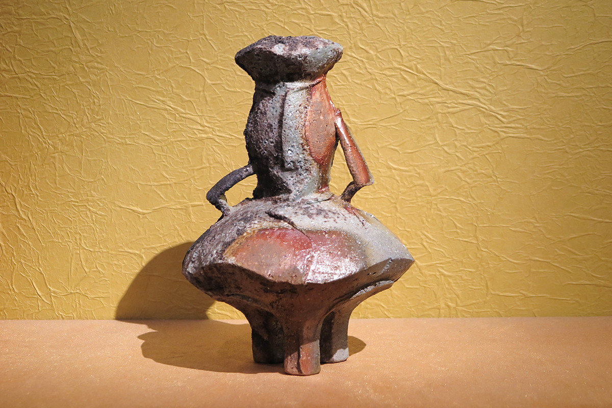 用とオブジェの境界をいくような作品にも注目したい。現代備前焼を代表する作家のひとり隠崎隆一の作品は花器、皿などのタイトルがついているが、その姿は従来の用を前提とした形態とは一線を画す。今回3点出展された作品の一つ「備前三足花器」。どこか舞う踊り子のようだ。