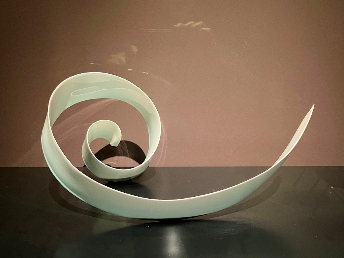 美術館の展示室は地下1階。まず目に飛び込んでくるのが2022年新たにコレクションに加わった木野智史の「颪」(おろし)。颪とは、山から吹き下ろす風のことだ。ろくろでひいた帯状の土をあらかじめ制作した型に載せて乾燥させて作られている。高度な技法もさることながら、風という空気の流れを陶で表現した意欲的な作品だ。