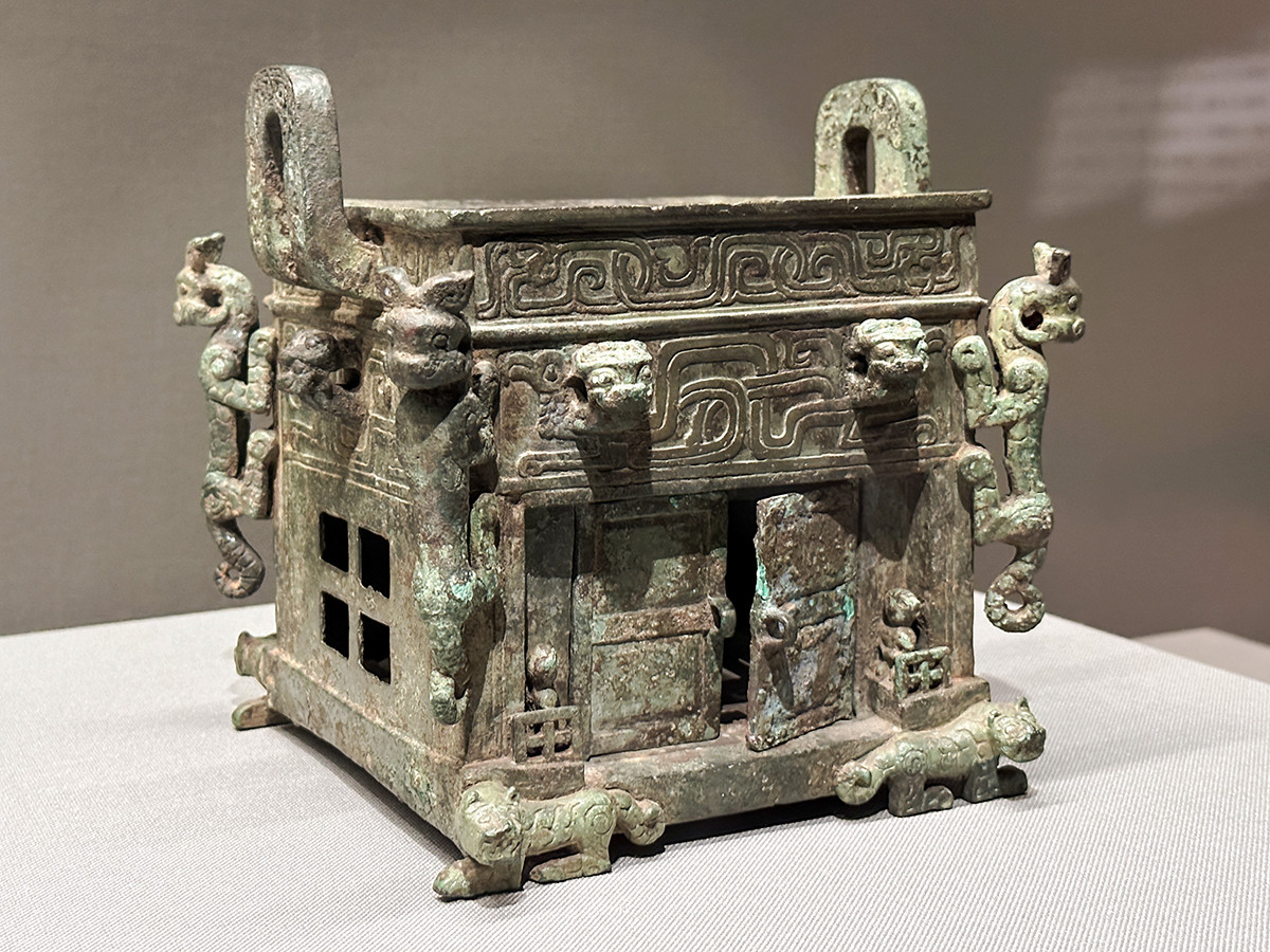 《虎卣》はユニークなデザインで人気が高い青銅器。虎が大きく口をあけて人を丸呑みしようとしており、人は虚ろな表情で遠くを見つめているかのようです。