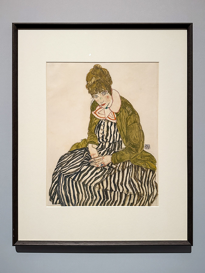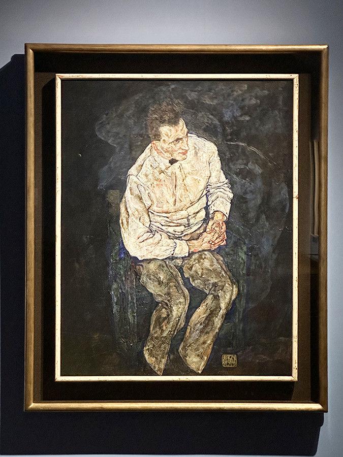 鑑賞者に視線を向けるシーレは、若き日の野心が感じられ、挑発的にもみえる表情。すばやい筆致で面を確実に捉え、配色や構図も申し分ありません。あまりにも早熟な才能に驚かされます。