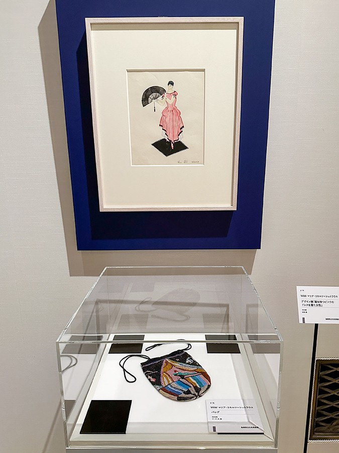 chapter 2「1914-1918」 (壁面)マリア・リカルツ=シュトラウス《デザイン画「扇を持つピンクのドレスを着た女性」》1916年 島根県立石見美術館 / (手前)マリア・リカルツ=シュトラウス《バッグ》1919年 島根県立石見美術館