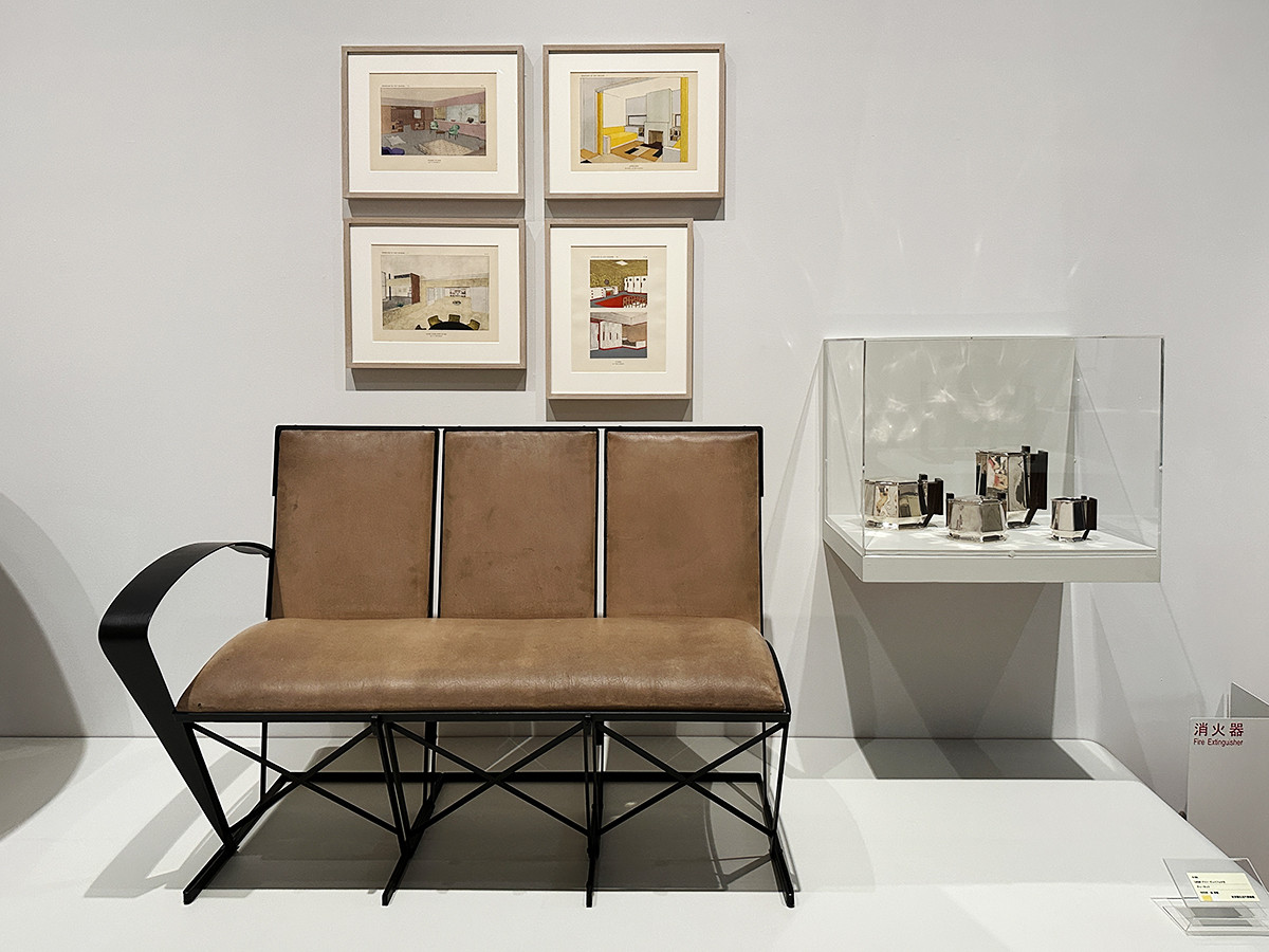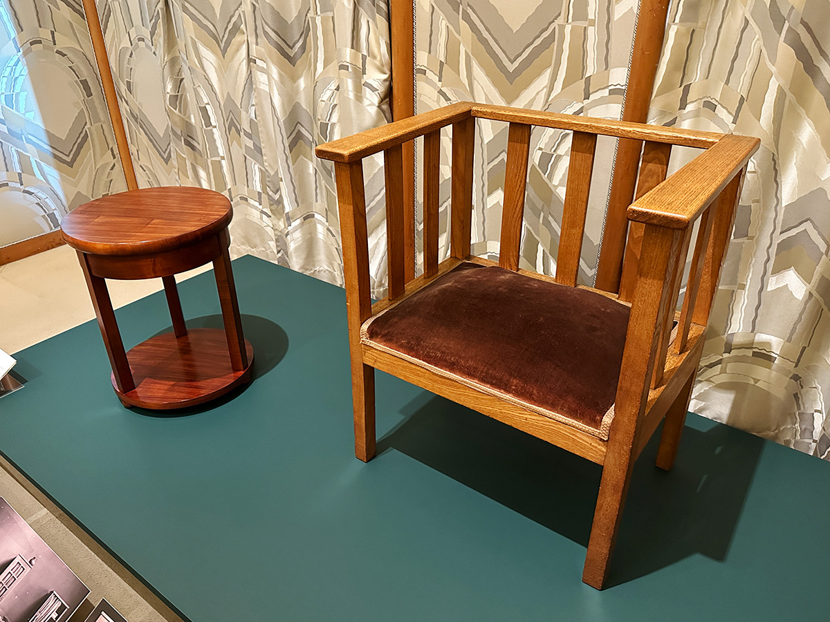 chapter 4「1926-1938」 (手前)ピエール・シャロー《鍛鉄製腰掛》1930-39年頃 東京国立近代美術館 / (壁面右のケース)ジャン・ピュイフォルカ《ティーセット》1925年 東京国立近代美術館