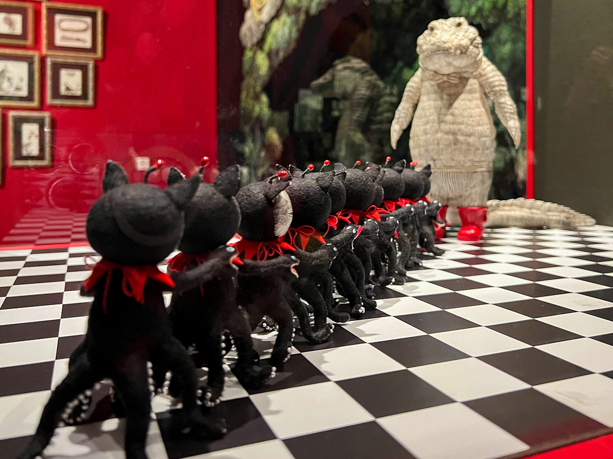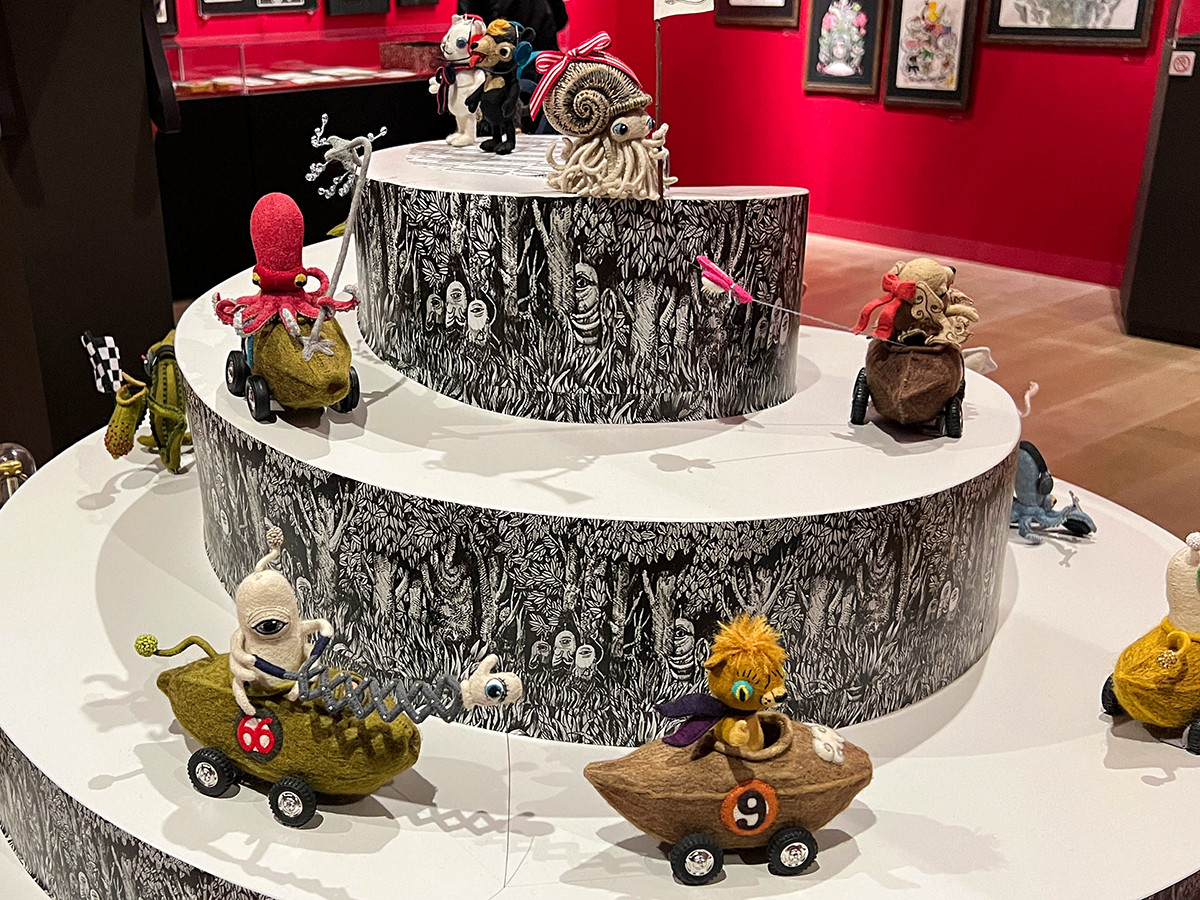 黒い通路を抜けると現れるのは、サーカスを模した空間。ヒグチユウコが背景を担当した「カカオカー・レーシング」(2017年、グラフィック社、今井昌代著)の立体展示は圧巻です。中を覗くと、絵本に登場するいきものたちのぬいぐるみが、らせん状に配置されています。