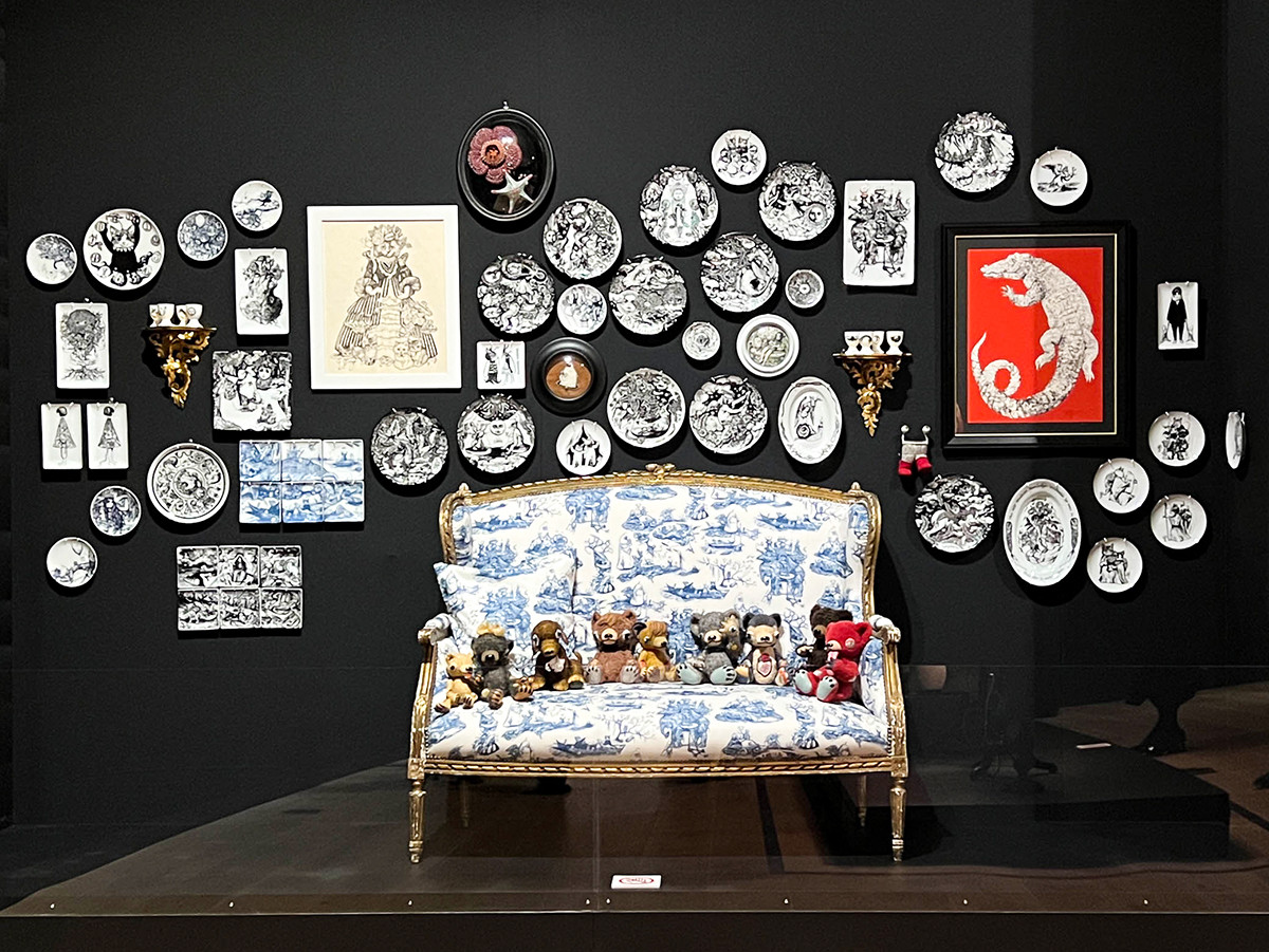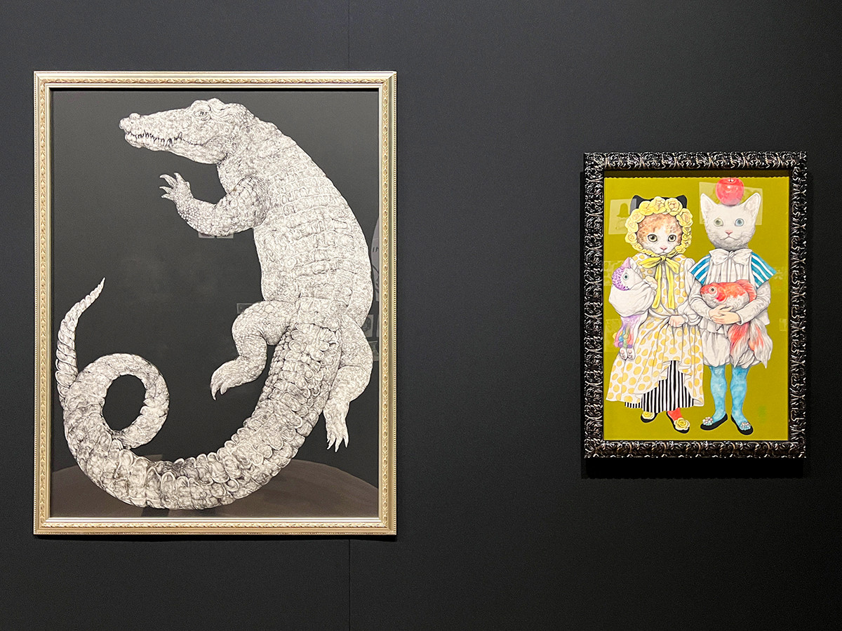 壁面にも作品が所狭しと飾られています。生き物や少女、キノコなど、可愛らしくもどこか不思議なヒグチユウコの世界観を十分に浴びることのできる空間です。