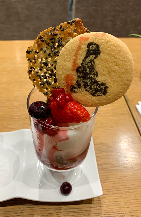 パフェのタイトルは《ふるへる女心の情念パフェ》。私はビターチョコフレークの食感が(元々はフレーク入りのパフェはそんなに好きじゃないのに)とても気に入りました。そしてベリーのソースにヨーグルトアイスが絡んで、舌の上でたまらない味わいに。上に飾られたサブレ生地のクッキーと胡麻のチュイールも食感の違いが楽しめます。