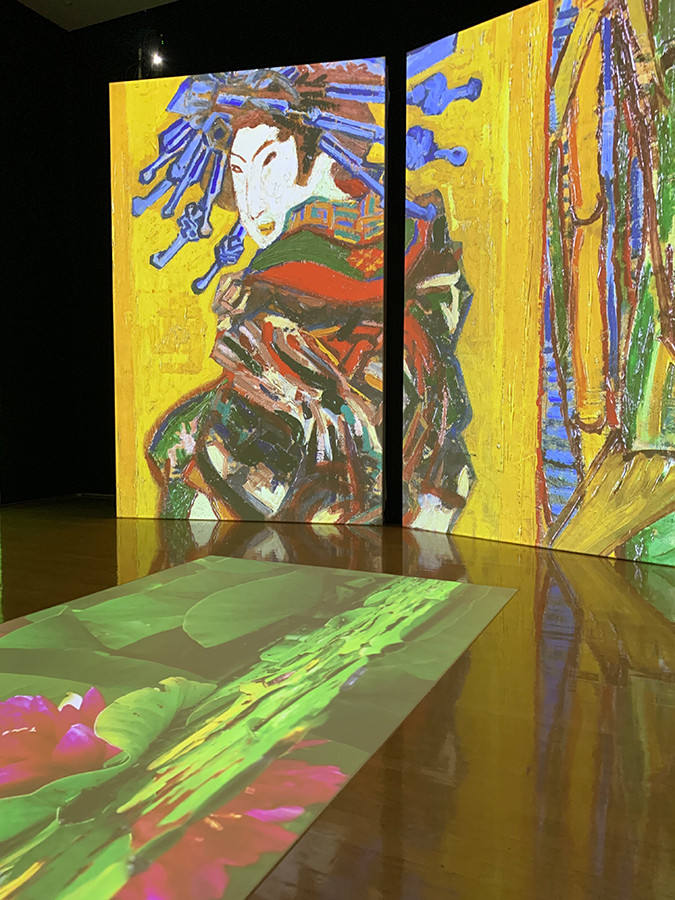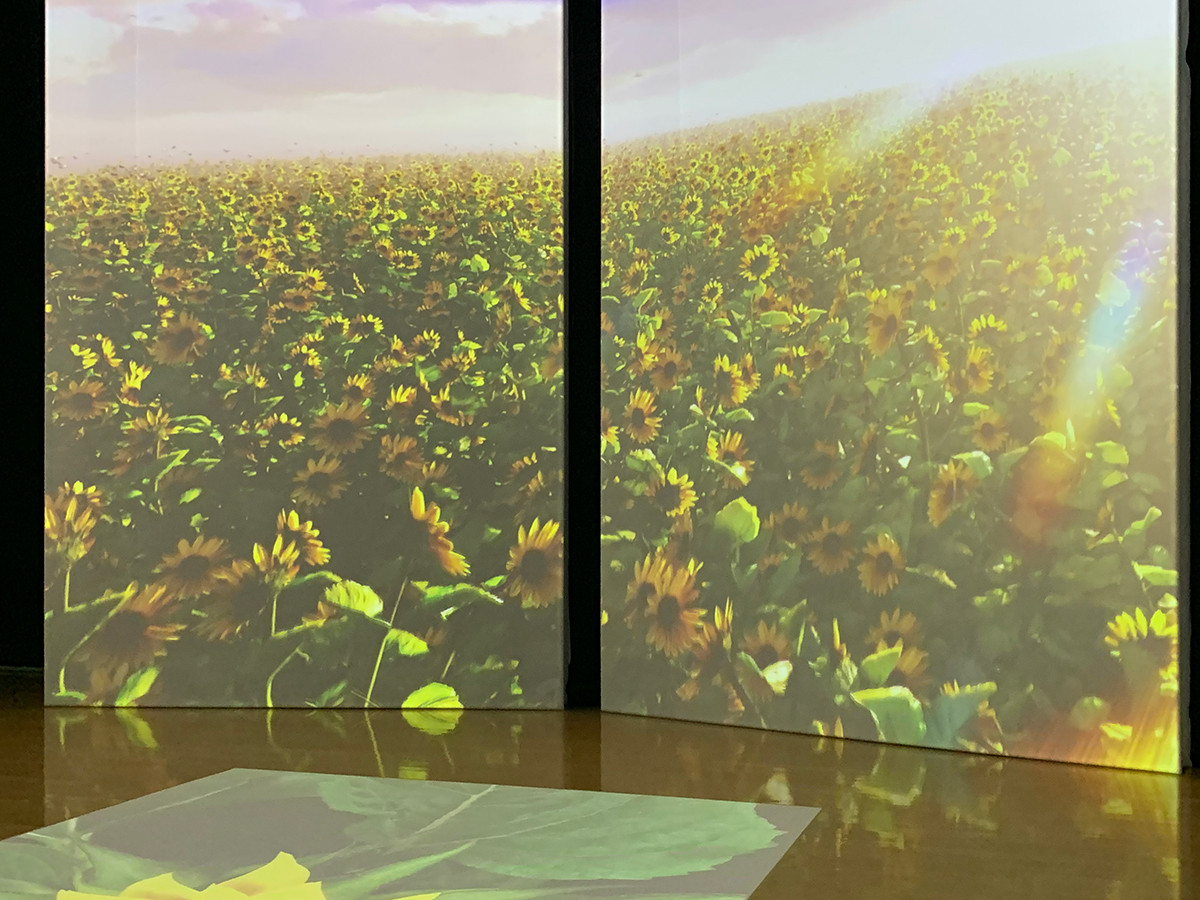 明るい太陽のアルル時代では、様々なひまわりがコラージュされ、いつもと違った感じ方ができます。床の上にも画像が溢れ出し、一体どこを見ていようか、迷いっぱなしでした。