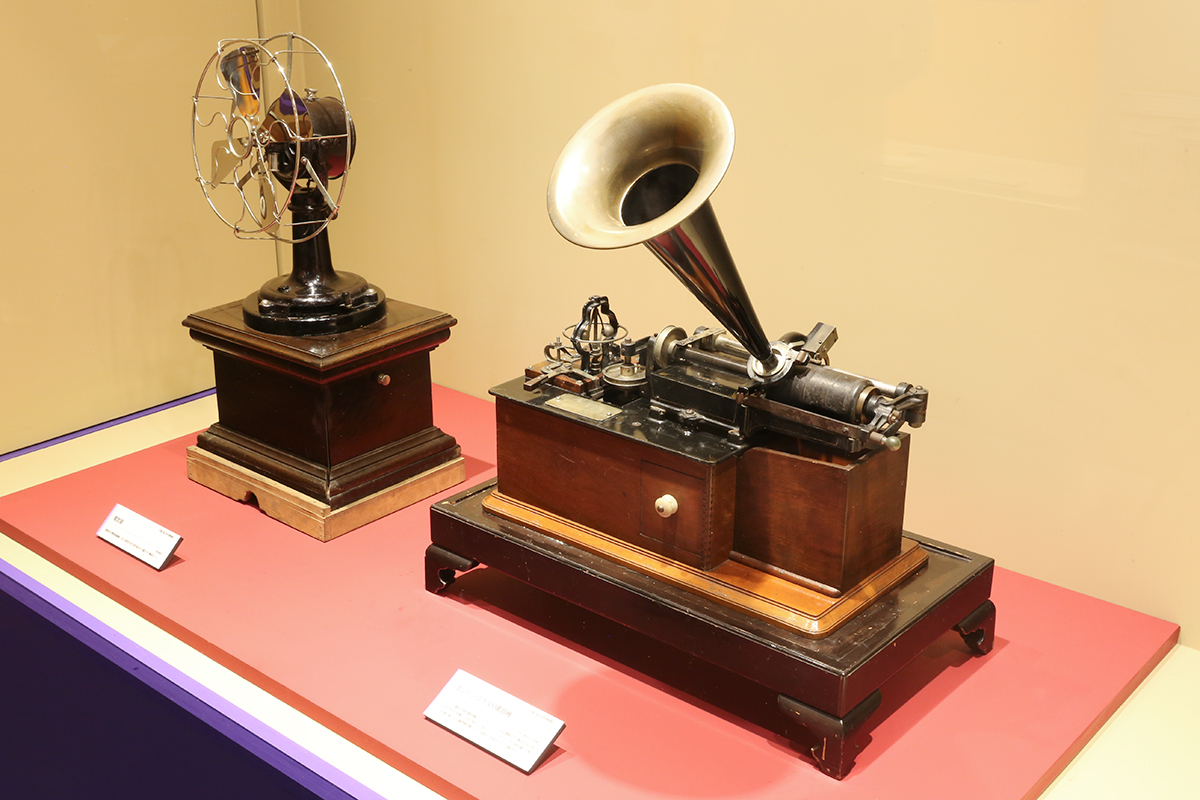 (左奥から)《電気扇》明治時代(左奥)《エジソン クラスM蓄音機》1890(明治23)年頃 ともに国立科学博物館
