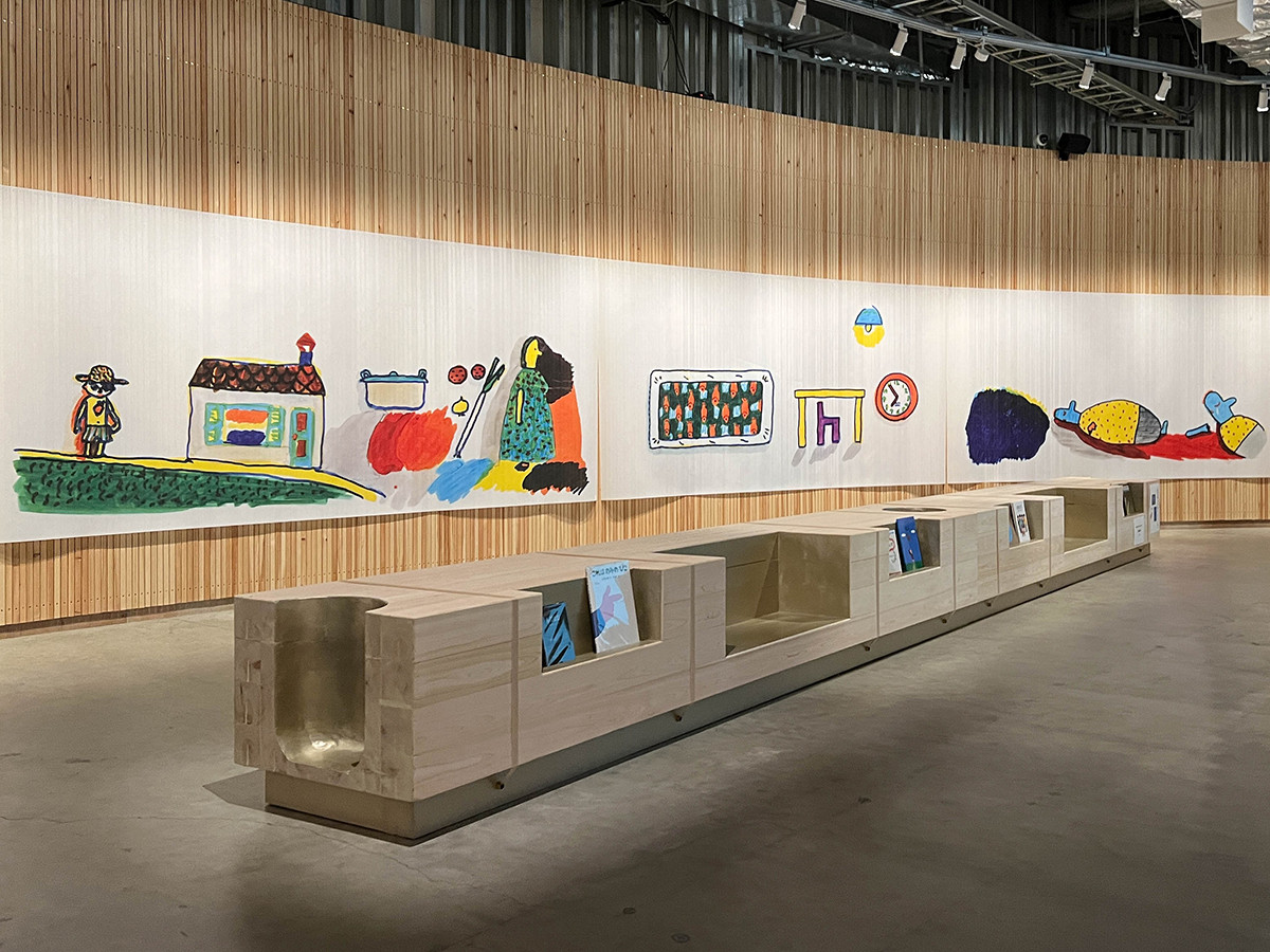 谷川さんは、イラストレーターの和田誠さんとも数多くの絵本を手掛けています。2人の共作絵本『あな』をイメージして、角材を組み合わせた8メートルものベンチがつくられました。