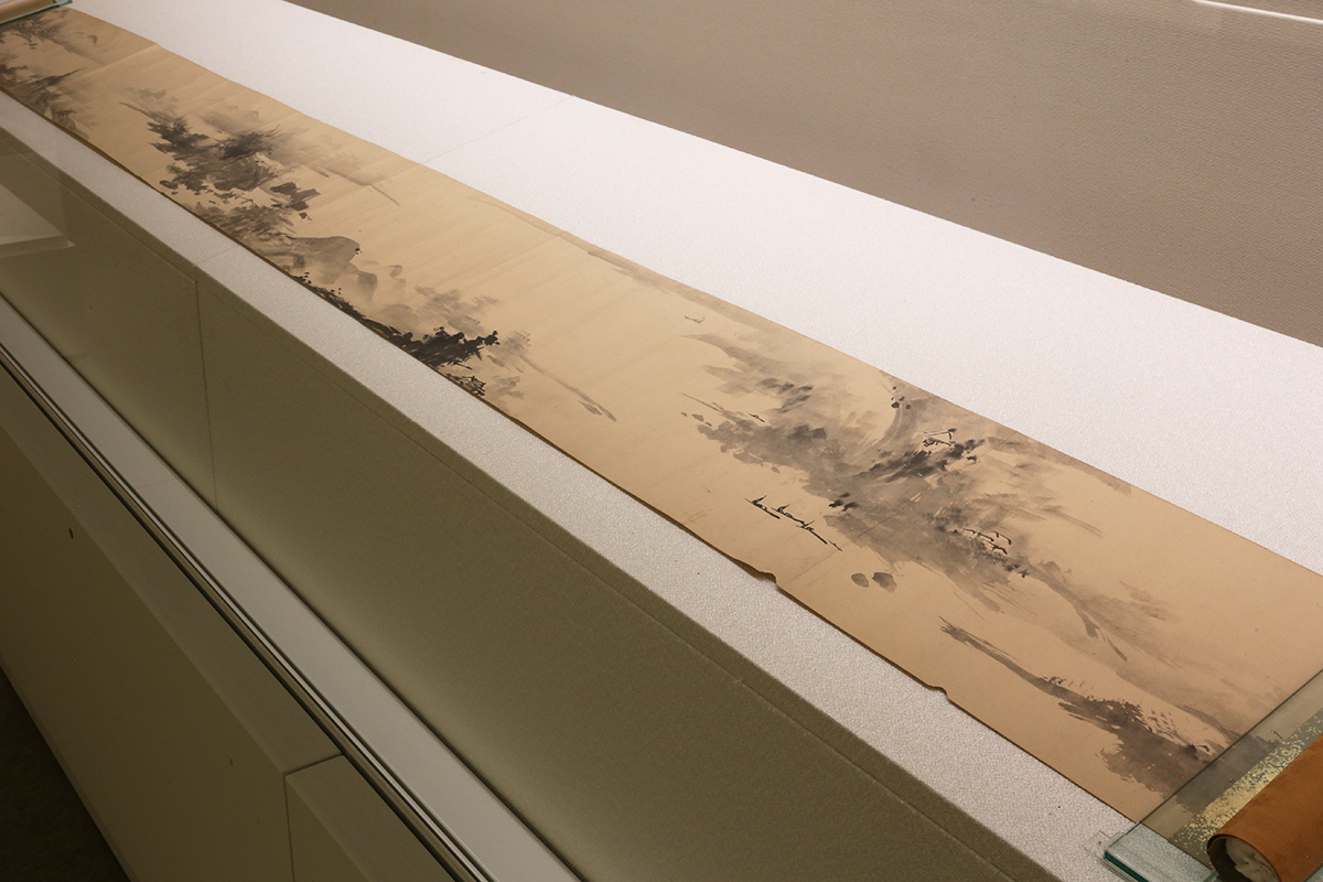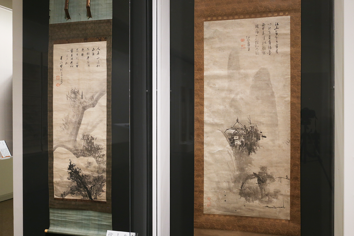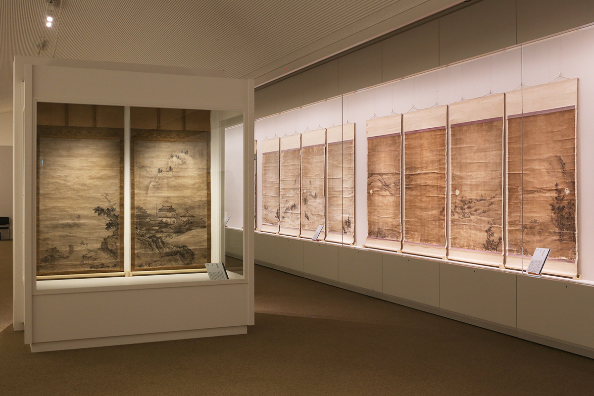 (左)雲谷等顔《楼閣山水図》熊本・松井文庫[展示期間:11/1~11/18] / (中央奥)雲谷等顔《溌墨山水図》広島・佛通寺 / (右)雲谷等顔《行体山水図》広島・佛通寺