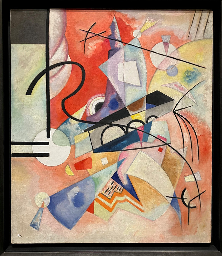 そして6年後の作品「E.R.キャンベルのための壁画No.4の習作(カーニバル・冬)」。事物の形態は完全に消失し、色彩が画面いっぱいに広がる。その後の「自らが輝く」は鮮やかな色彩と同時に黒で描かれた曲線と直線が織りなす典型的なカンディンスキーの抽象画だ。