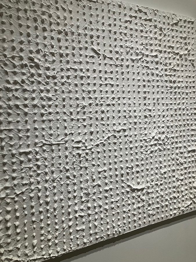 自らを彫刻家と称する横溝美由紀はキャンバスの上で油彩を含ませた糸をはじいて無数のラインを引いた作品や床に展開したアルミニウムで構成したインスタレーションを出品、また髙畠依子はキャンバスに漆喰を塗ることで現れる抽象模様を作品化、さらに柴田敏雄の写真が今回の展覧会で紹介されているのも抽象絵画の概念の広がりを感じさせる。もはやキャンバスと油彩という従来の抽象絵画の概念を大きく超えた作風の数々には驚かされる。