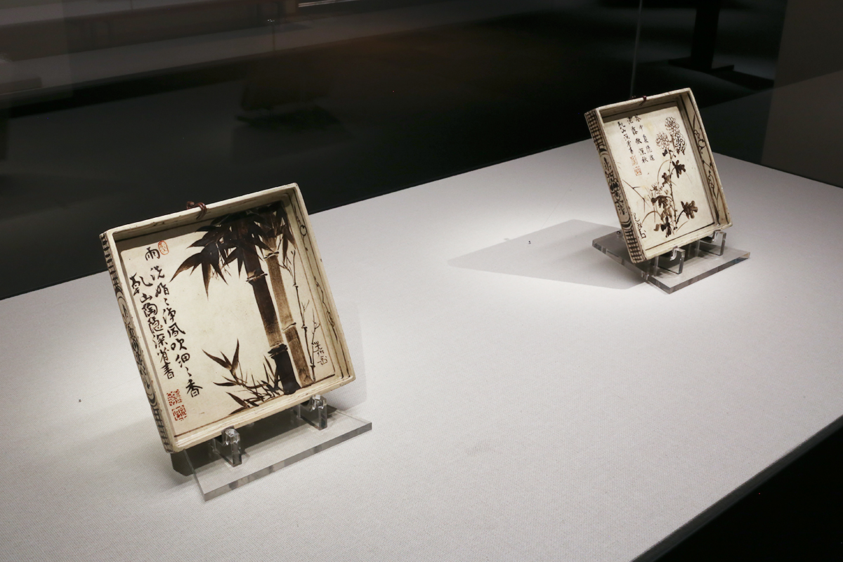 (左手前から)尾形乾山 尾形光琳 画《銹絵竹図角皿》 / 尾形乾山 尾形光琳 画《銹絵菊図角皿》 ともに出光美術館蔵