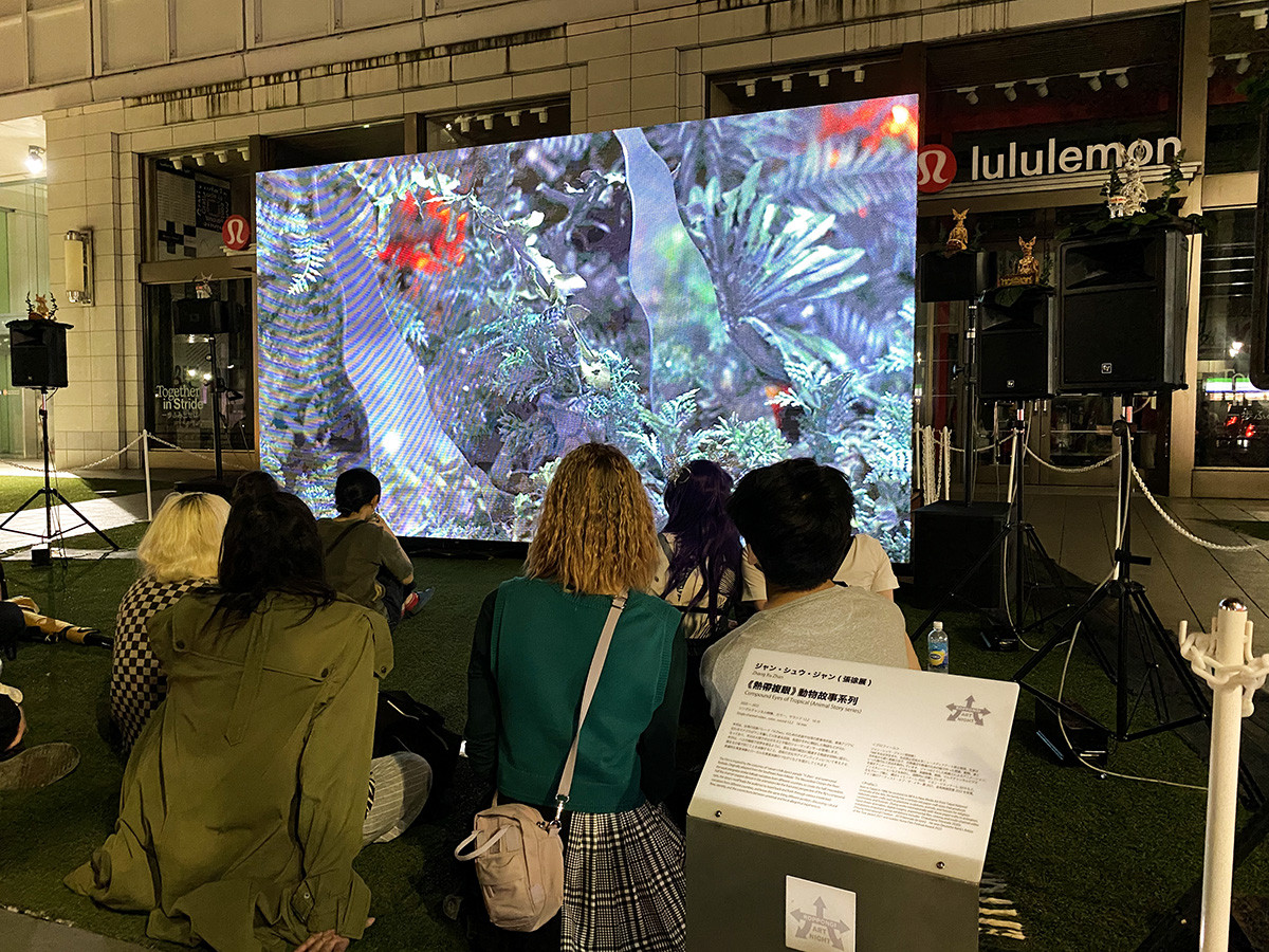 まちなか作品は、どこも込み合っていますが、東南アジアの民話を下敷きにした、ジャン・シュウ・ジャンの人形劇の映像作品も、よく混雑していました。大勢の歩行者が通路に立ち止まって作品を見ていくので、真夜中でも誘導と保安のスタッフの人々が忙しそうに働いていました。