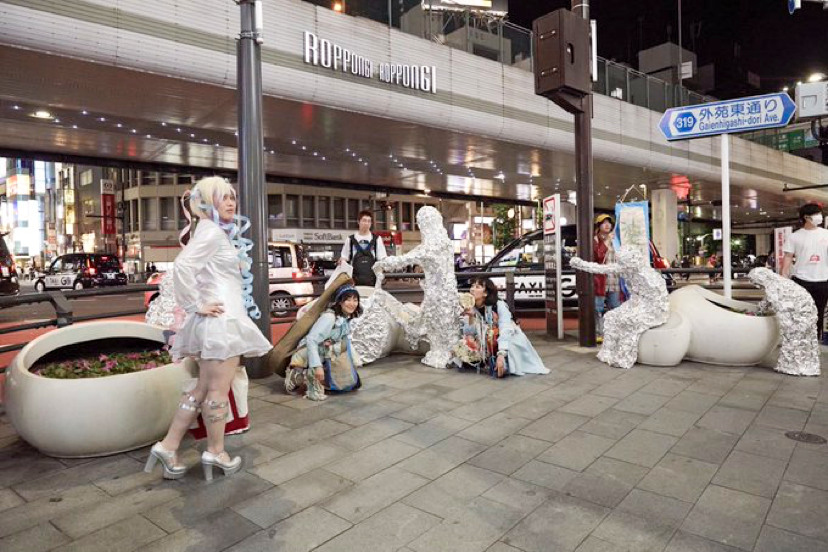 そこに、奇妙なコスプレの一行が来ました。アーティスト・ユニットの「このよのはる」と、友人たちです。その他にも、秋葉原で出会いそうな、ふわふわのドレスの観客などが、順番待ちして記念撮影をしていました。