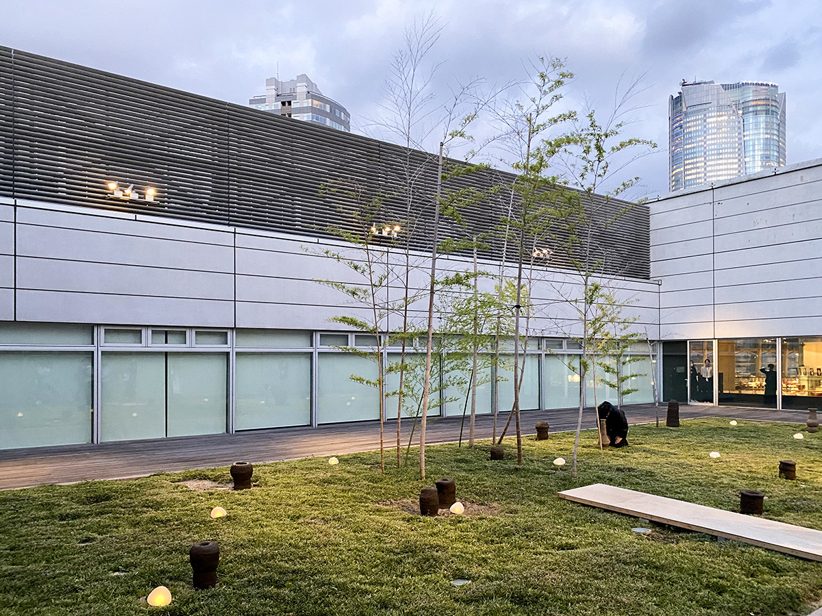新国立美術館の3階の中庭では、しばたみづきの制作パフォーマンスが公開されています。芝生の中に点在するつぼは、濡れていて、触るとひんやりとします。焼かない土器なので、雨が降ると溶けて崩れてしまいそうですが、作家としてはそれも面白いと考えているようです。
