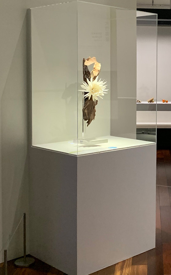 一夜しか咲かない月下美人という植物。そんな儚い命の咲きざまを木彫で表現した大竹亮峯さんの「月光」。繊細な花を硬い木で表現しているだけでも驚きなのに、水を注ぐとまるで本物のように花開きます。