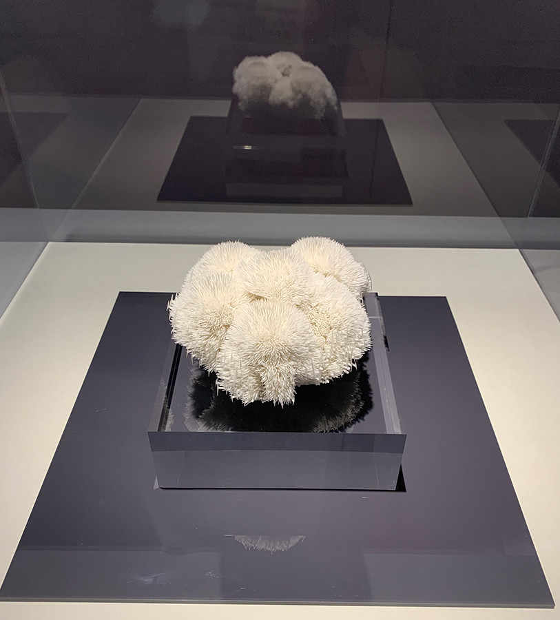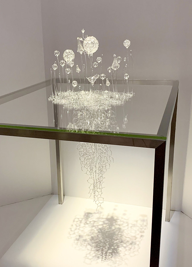 ガラス細工の青木美歌さんの作品では、水の世界へといざなってくれます。水の中にいる生命体の中を遊覧しているような、時が止まった菌類の世界みたいに感じました。