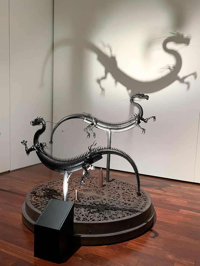 蝋燭を灯すと龍が動き出す、金工の本郷真也さんの《円相》。また《Visible 01 境界》のカラスの体内には、餌と間違えて飲み込んだ銀の異物が入っているそうです。そんなの見えないのになぜ?と思いましたが、いつか鉄が朽ち果てて内部が見えるという、時間経過までも表現されています。
