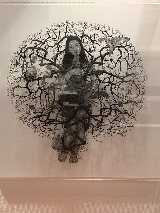 盛田亜耶さんの切り絵。会場では、アクリル板に収められていて細部までゆっくり見ることができます。信じられないくらい細く、まるでペンで描いたかのような線で表現された作品は、平面なのに3Dのように浮き上がって見え、思わず溜め息が出てきます。