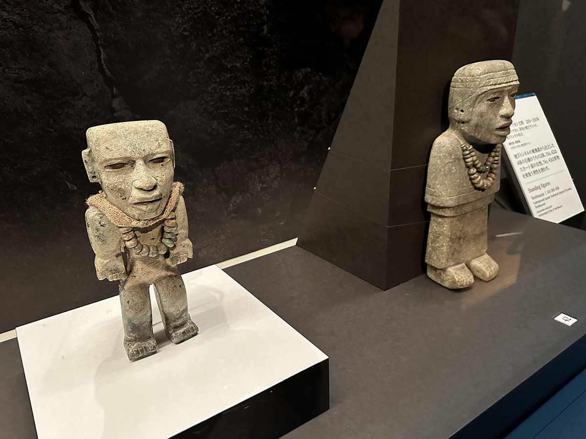 《耳飾りを着けた女性立像》は、埋葬墓2からの出土品です。これらの副葬品とともに、両手を後ろで縛られた生贄、ピューマやオオカミなどの動物も見つかっています。