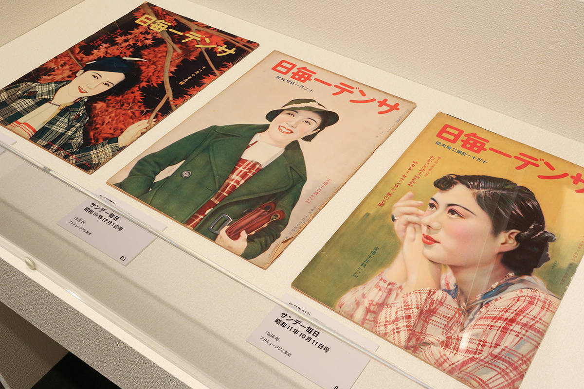 (左奥から)毎日新聞社《サンデー毎日 昭和10年11月17日号》1935年 / 毎日新聞社《サンデー毎日 昭和10年12月1日号》1935年 / 毎日新聞社《サンデー毎日 昭和11年10月11日号》1936年 すべて アドミュージアム東京