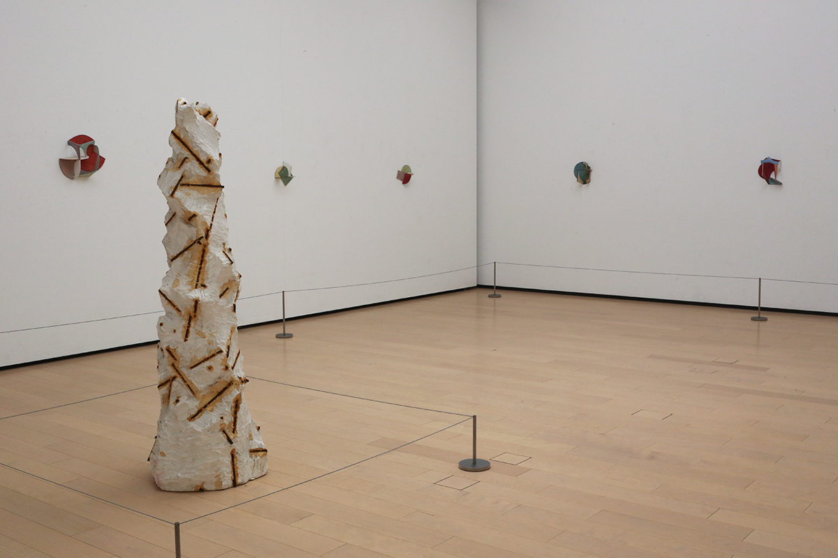 (手前)戸谷成雄《「《彫る》から」搭状のもの》1982 MTMコレクション / (奥壁面、左から)岡﨑乾二郎《そとかんだ》1981 高松市美術館 / 岡﨑乾二郎《のがた》1981 高松市美術館 / 岡﨑乾二郎《たまち》1981 高松市美術館 / 岡﨑乾二郎《かっぱばし》1981 個人蔵 / 岡﨑乾二郎《あかさかみつけ》1981 高松市美術館