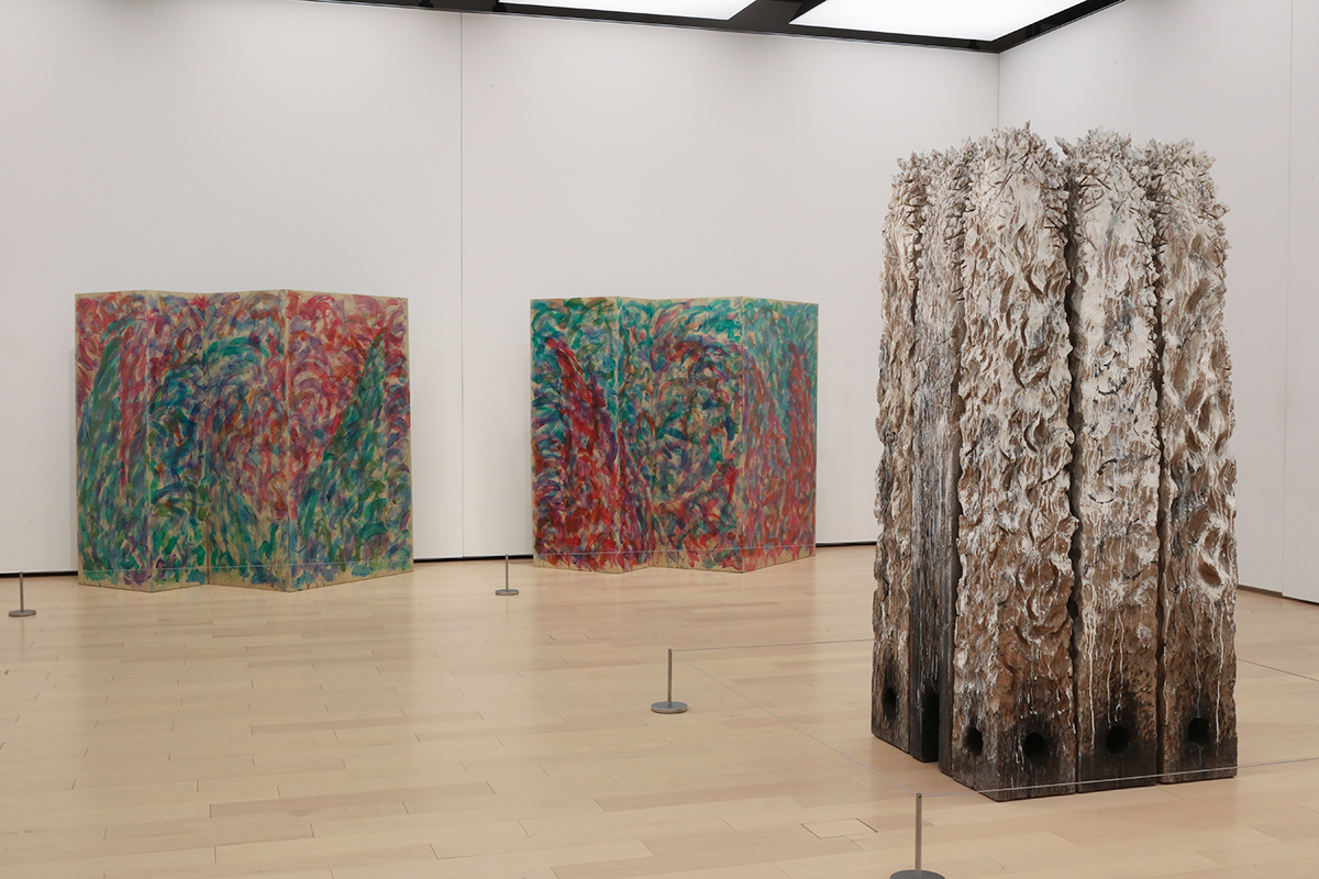 (奥、左から)諏訪直樹《波濤図 No.2》1980 / 諏訪直樹《波濤図 No.1》1980 ともに三重県立美術館 / (右手前)戸谷成雄《中庭Ⅱ》1990 高松市美術館