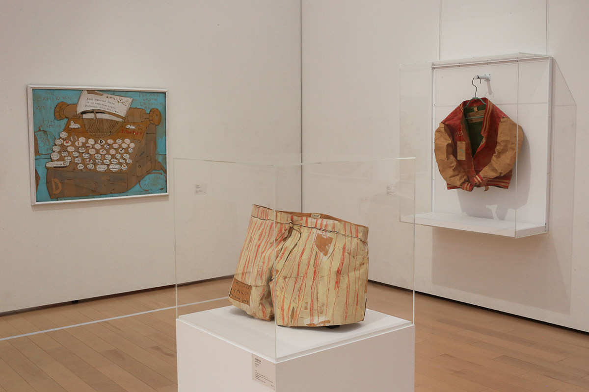 (左から)日比野克彦《TYPEWRITER》1983 作家蔵 / 日比野克彦《PANTS》1983 岐阜県美術館 / 日比野克彦《SWEATY JACKET》1982 岐阜県美術館
