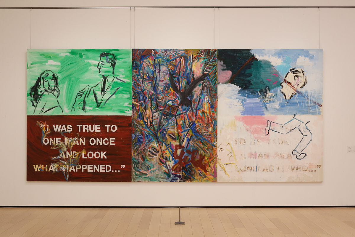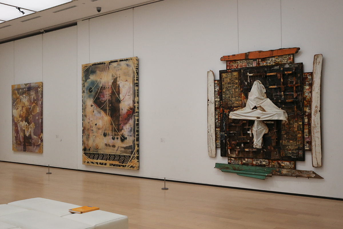 (左奥から)大竹伸朗《網膜 #39(投げ縄)》1990-91 高松市美術館 / 大竹伸朗《網膜 #9(ブラウン・ヘッド)》1988-90 セゾン現代美術館 / 大竹伸朗《家系図》1986-88 セゾン現代美術館