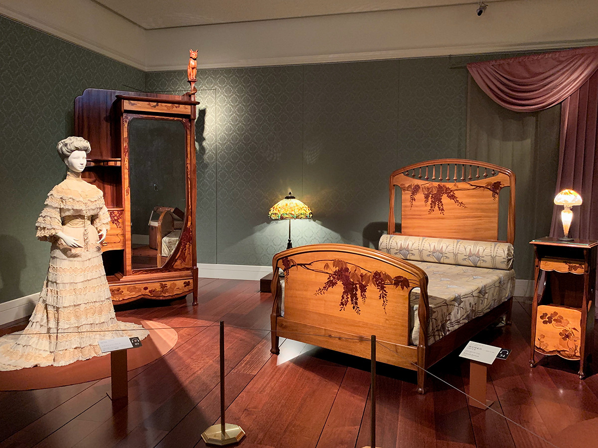 アール・ヌーヴォー時代に流行したS字ラインのドレスです(画像左)。作品内のドレスと、展示されたドレスを比較して、当時のおしゃれを楽しむことができます。