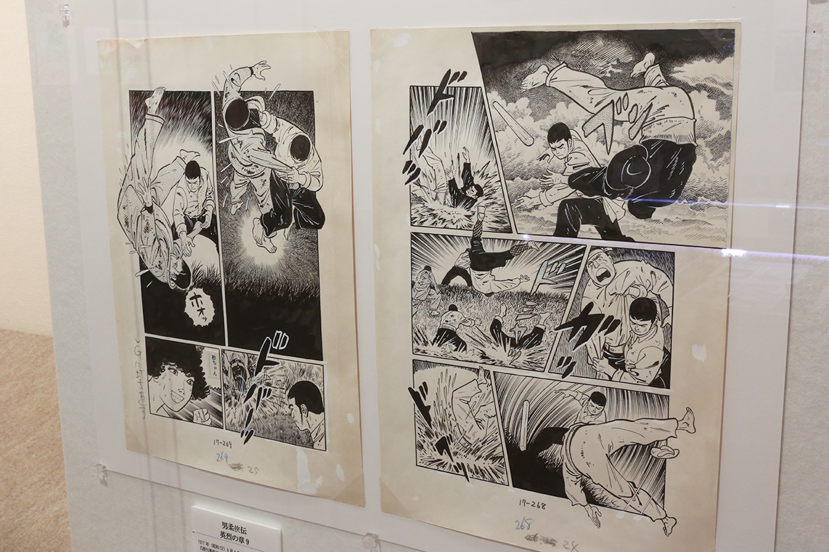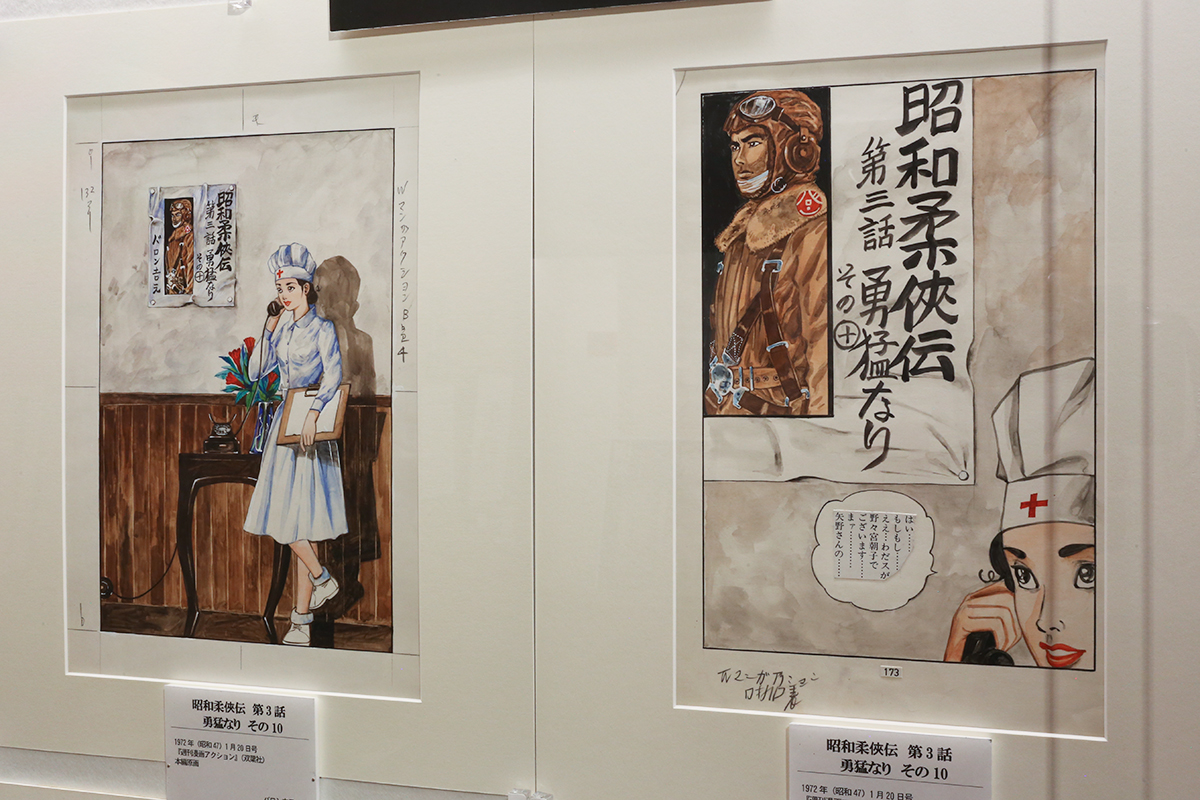 (左から)《昭和柔俠伝 第3話 勇猛なり その10》1972年1月20日号「週刊漫画アクション」(双葉社)本稿原画 / 《昭和柔俠伝 第3話 勇猛なり その10》1972年1月20日号「週刊漫画アクション」(双葉社)扉絵原画