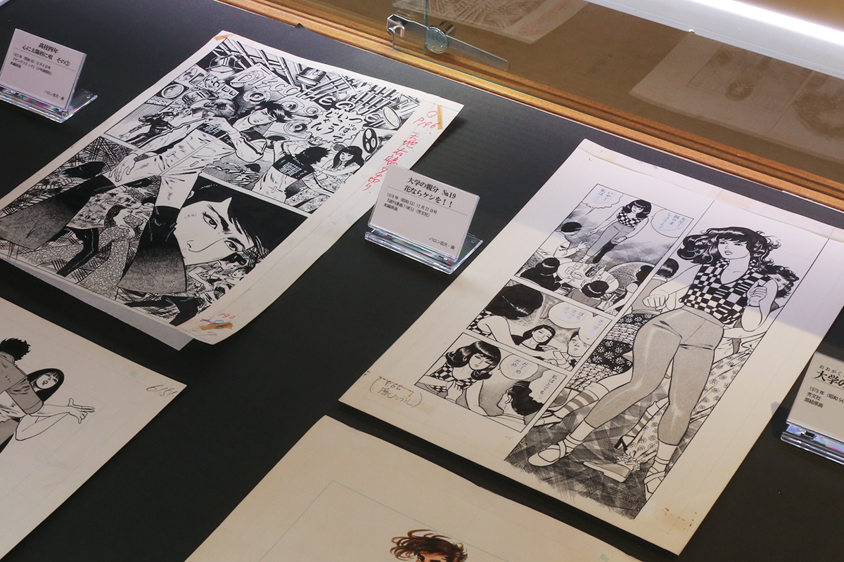 (左から)《大学の親分 No.19 花ならケシを!!》1978年12月22日号「週刊漫画TIMES」(芳文社)本稿原画 / 《大学の親分 第4巻》1979年12月 芳文社 扉絵原画