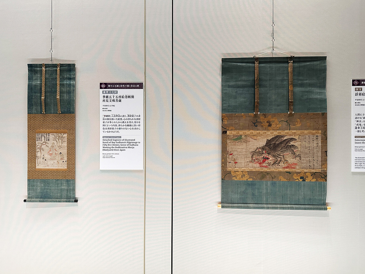 (左から)重要文化財《華厳五十五所絵巻断簡 再見文殊菩薩》平安時代・12世紀 東京国立博物館蔵[展示期間:10/11~11/5] / 国宝《辟邪絵 神虫、毘沙門天像》平安時代・12世紀 奈良国立博物館蔵[展示期間:10/11~11/5]
