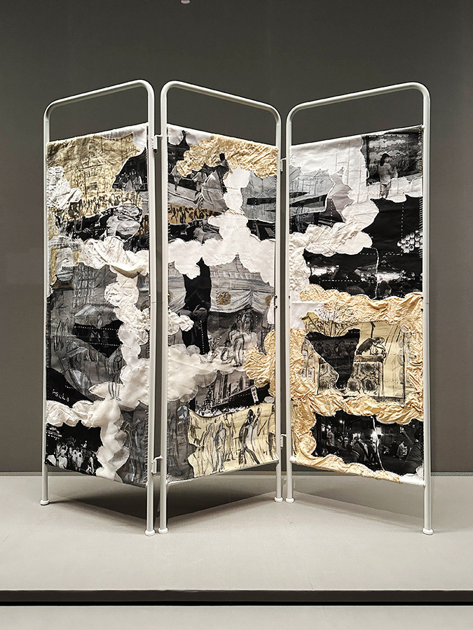 澁澤星(1983-)の作品は、掛軸や屛風を思わせるしつらえに、人物を含む絵画で構成。手前に調度品も組み合わせて、空間を構成しました。