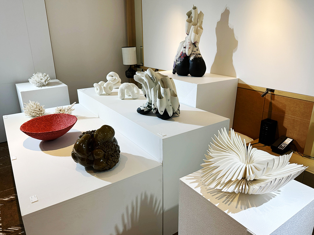 金沢駅近くのハイアット セントリック 金沢で開催された「KOGEI Art Fair Kanazawa 2023」。会場は2階、5階、6階の3フロアです。 2階のインフォメーションを抜け、奥に並ぶのは、5名の作家の作品です。日本経済の根幹である「ものづくり」の継承と発展、そして工芸が包含するサステナブルな思想の継承を目指す「MUFG工芸プロジェクト」(総合監修:秋元雄史氏)の展示です。