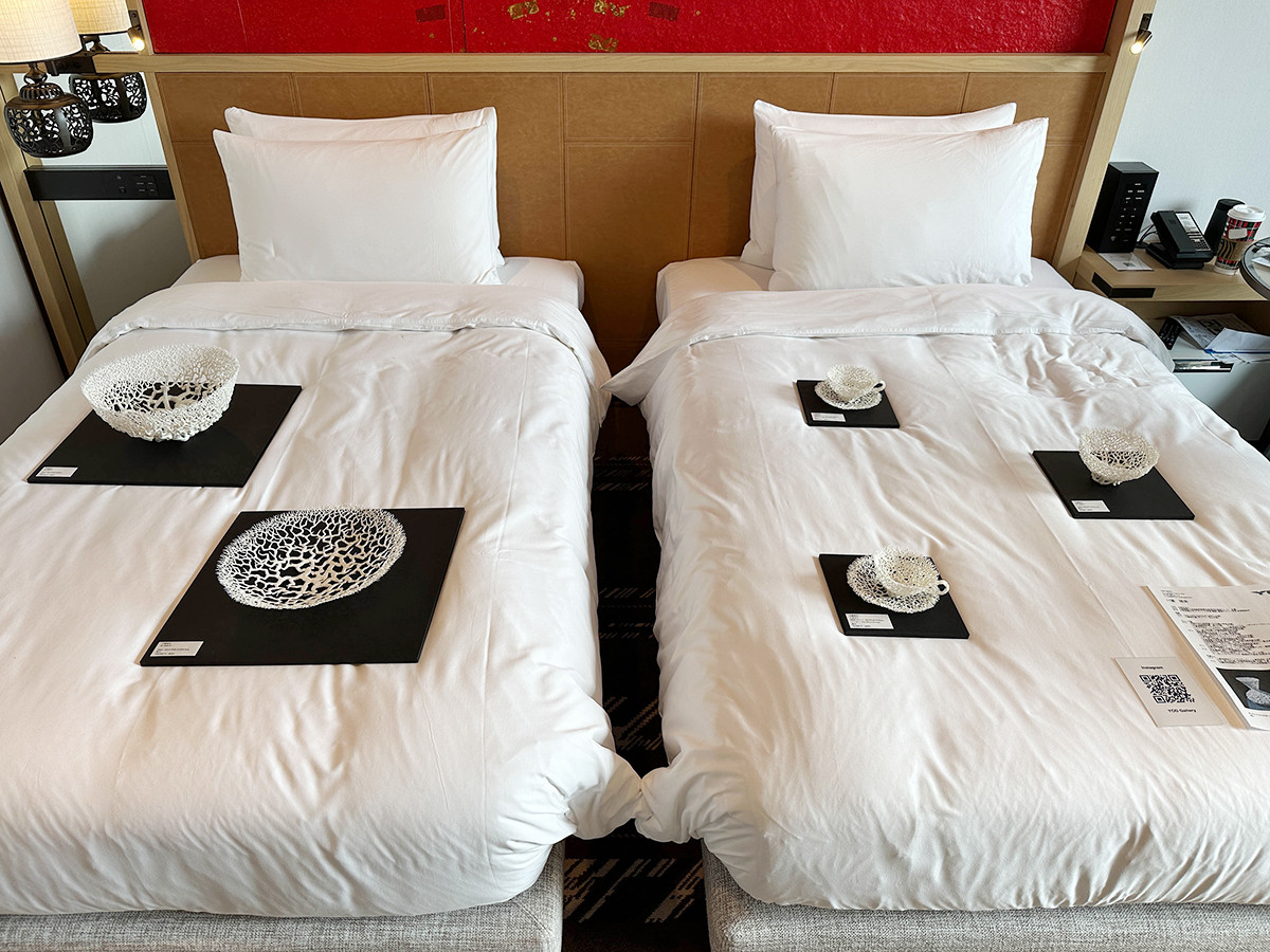 今回出展しているのは日本32、台湾7、韓国1と、計40ギャラリー、過去最多の規模になりました。 特筆すべきは、ほとんどのギャラリーが客室で展開していること。通常のアートフェアは大きなホールで小間割りのブースが並びますが、ここではそれぞれの客室に作品が設置されています。 日常の生活と近い距離にある工芸の特性にあわせた、珍しい試みです。
