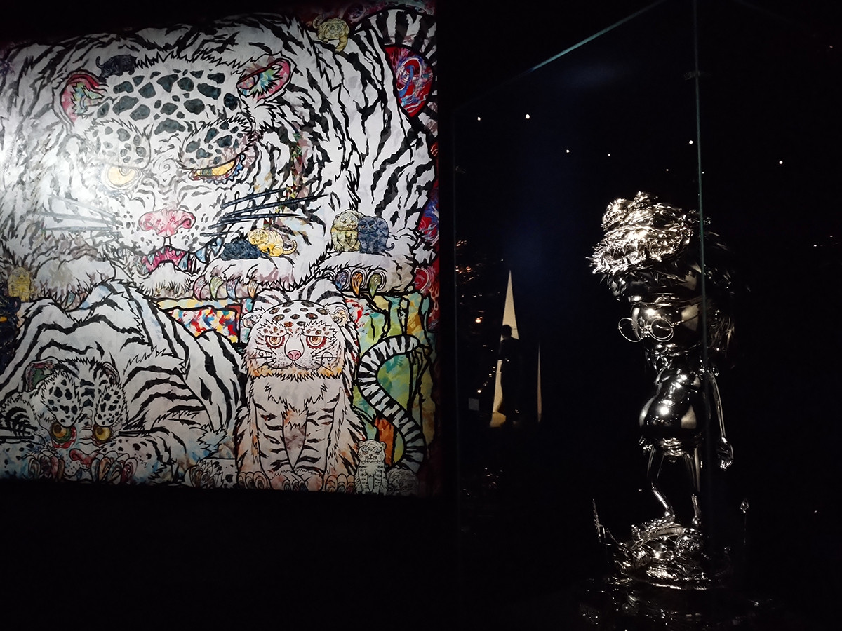 村上隆《白虎 京都》 2023-2024 (手前)《想像を超えた宇宙の活性を想起する》 2018