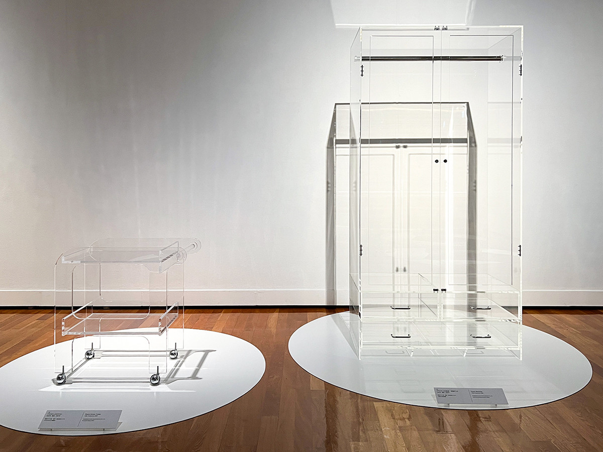 いくつもの引き出しが全面に設えられた《引出しの家具》をはじめ、依頼されたものでもなく、使用される予定のないデザインを具体化していきます。また、ものを見せることや空間のあり方を探り、什器の素材に当時一般的だった木材でなく、透明アクリルを使用。ケースの中がすべて透明になることで、商品が宙に浮いているかのような効果をもたらしました。