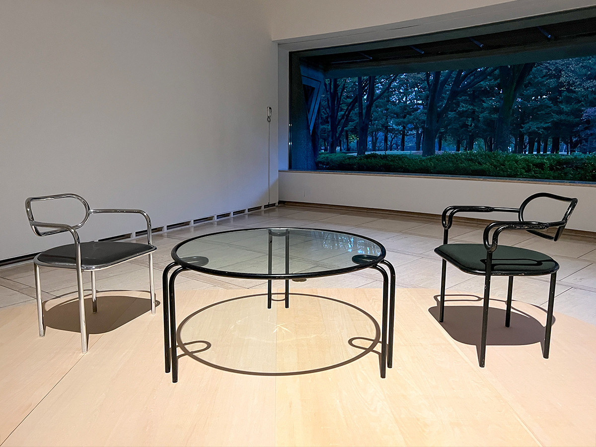透明アクリルのチューブのなかに蛍光灯を仕込み、そこに透明アクリルの棚を渡し衣服を陳列。椅子やテーブル、ランプからは、倉俣がいかに光の存在の仕方を意識していた窺い知ることができます。