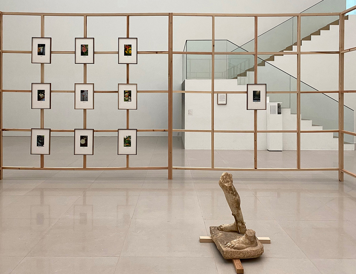 展示室の中に大きな木の柵が置かれています。展示室入口とは反対側に柵の入口があり、作品は柵の内側から鑑賞するようです。柵の内側の壁面には、たくさんの美しい花の写真が掛けられています。また、花に囲まれ、脚部だけの石像も置かれています。不思議な取り合わせに、とても強い違和感を覚えます。