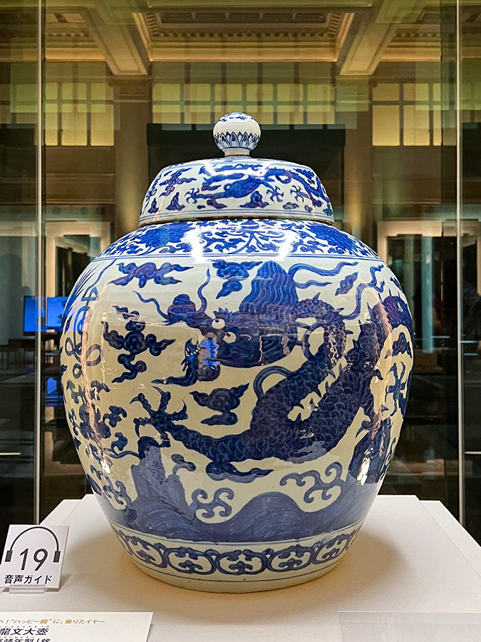 会場入口のホワイエには、龍が描かれた清朝・乾隆銘の大盤や、超大型の壺などの工芸品に彩られ、まるで新年を祝う装いとなって出迎えてくれます。