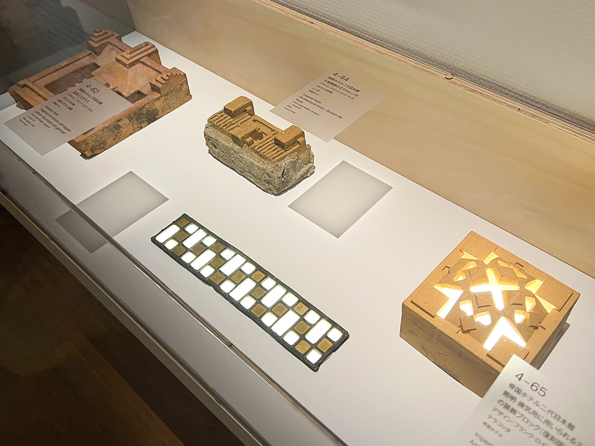 支配人の林愛作から依頼を受けた帝国ホテルは、ライトが日本に延べ3年以上滞在しながら設計。セクション4では、図面や家具、帝国ホテルの一部を構成していたテラコッタや大谷石のブロックのほか、3Dスキャン計測データを用い3Dプリントで制作された100年前の帝国ホテル模型を公開しています。