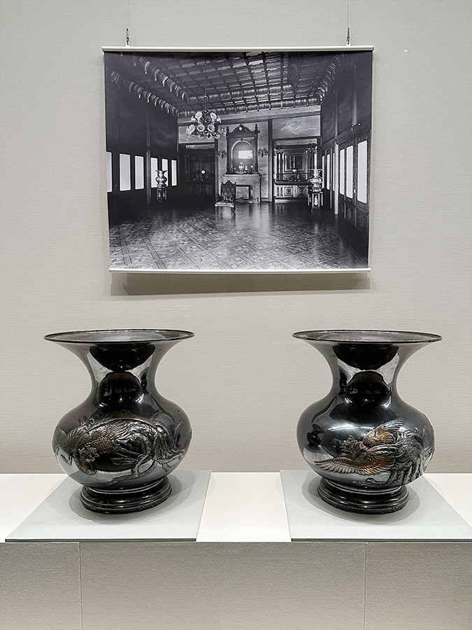 明治宮殿を彩った花瓶や花盛器など。後方には当時の明治宮殿の写真も。